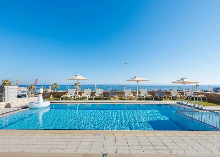Guests can enjoy a seaside pool view from a terrace at Irida Beachfront Villa For 12 Steps To Amenities Rethymno, 25 minutes' walk from the Platanes area. Guests can enjoy pool at the 5-bedroom villa, located 3.4 km from the city park "Municipal Garden".